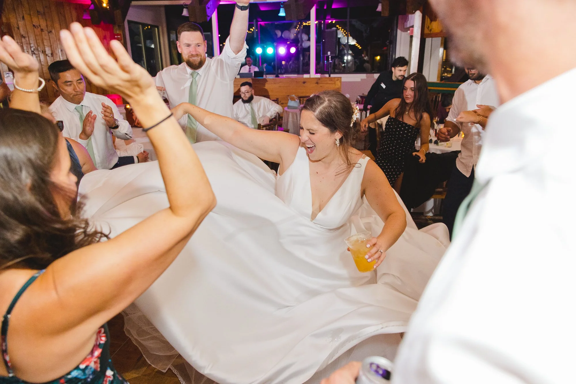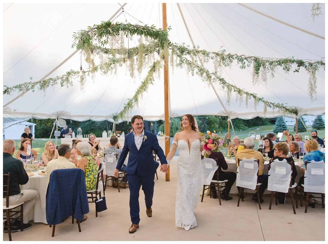 If your wedding party has their heart set on doing a big intro, then just ignore this advice! If you’re on the fence, I would recommend either just doing an intro for the wedding couple, or I’ve seen it done where the wedding party is just introduced as “the wedding party” and they all come in as a group. The reason I would lean towards this is because it usually takes 10-15 minutes for the DJ or emcee to get everyone lined up, figure out the names (which unfortunately you usually can’t even hear very well when they’re doing the introductions) and different songs, etc. It just takes away more time from the party getting started and the longer your guests are sitting and waiting, the more restless they become.